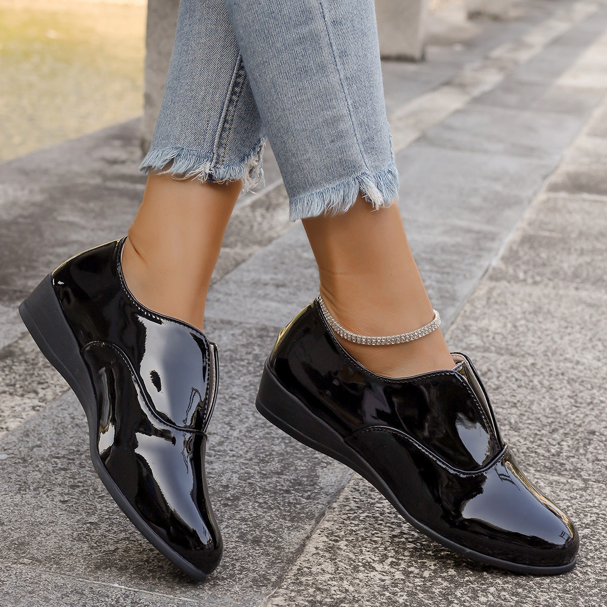 These slip-on loafers with a subtle sheen and low wedge heel give you a light, comfortable feel all day long. Perfect for everyday wear during autumn and winter, they combine practicality with understated elegance. Available in both classic black and eye-catching leopard print.